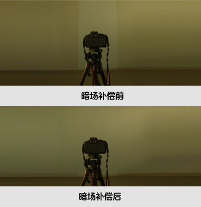 投影機(jī)的漏光,是指投影圖像為全黑色的時(shí)候,投影機(jī)仍舊有一部分光線能投射到投影幕上。這樣兩臺(tái)投影疊加以后,在純黑場(chǎng)的時(shí)候會(huì)出現(xiàn)一個(gè)中間亮帶。融合器需要用提升非疊加部分光強(qiáng)的方式,來(lái)抵消亮帶,這一個(gè)過(guò)程為暗場(chǎng)補(bǔ)償。